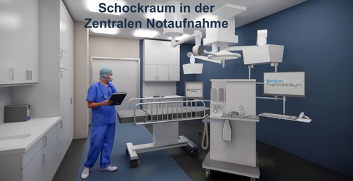 Die hochauflösenden Darstellungen zeigen auch kleinste Details und schaffen eine lebendige Atmosphäre. So bekommt man einen Einblick in das Foyer des Flugfeldklinikums mit Cafeteria oder in die Notaufnahme mit dem Schockraum. In einem Schockraum werden schwer- und schwertverletzte bzw. erkrankte Patienten erstversorgt.