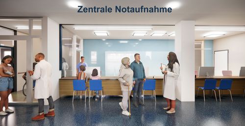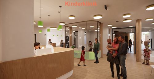 Eltern, die mit ihren kranken Kindern ins Flugfeldklinikum kommen, gelangen direkt vom Foyer in den Ambulanzbereich der Kinderklinik mit Anmeldetresen und Wartebereich. Für die Kinderklinik wurde ein eigenes Design entwickelt, welches dank der Visualisierung schon heute sichtbar ist.