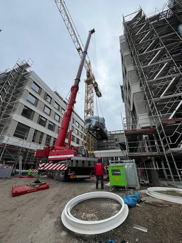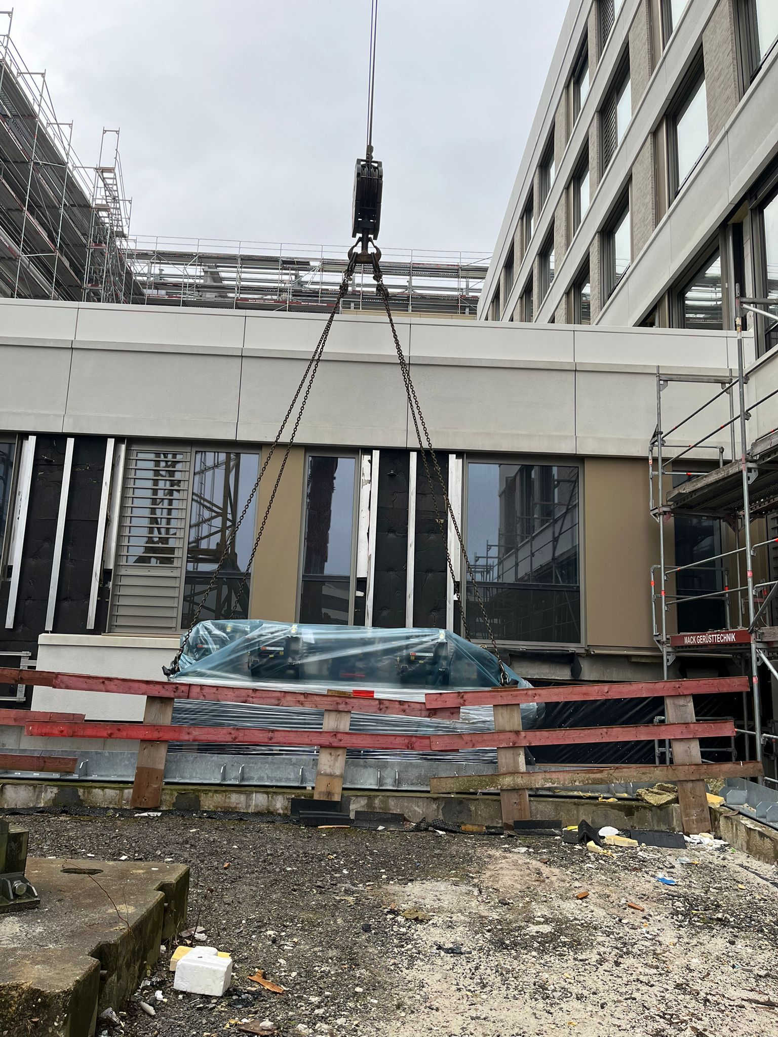 Mit dem Kran wurden die Geräte über einen Lichtschacht ins Untergeschoss des Flugfeldklinikums gehoben. Daran waren zehn Personen einen halben Tag lang beteiligt. Doch damit war die Arbeit noch nicht erledigt. Denn die beiden Kältemaschinen mussten noch innerhalb des Gebäudes an ihren finalen Standort gebracht werden.