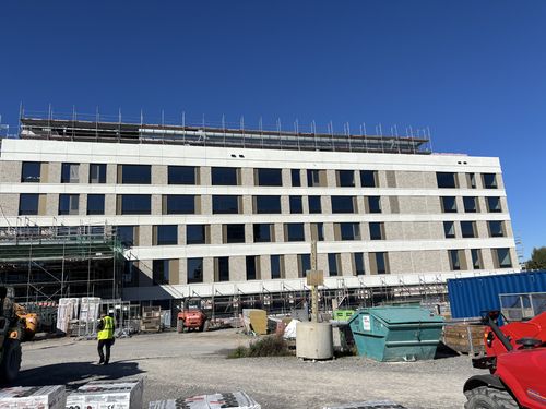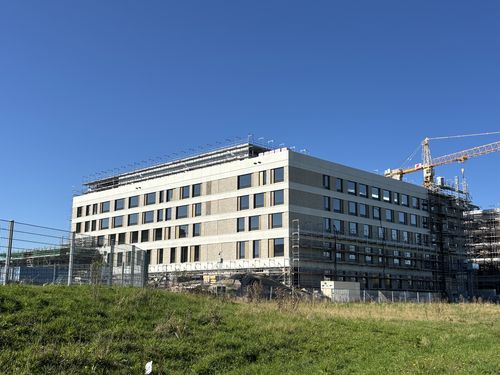 Einige Gebäudeteile bleiben noch eingerüstet. Das Gerüst wird für weitere Arbeiten benötigt. Insgesamt stehen am Flugfeldklinikum 60.000 Quadratmeter Gerüst.