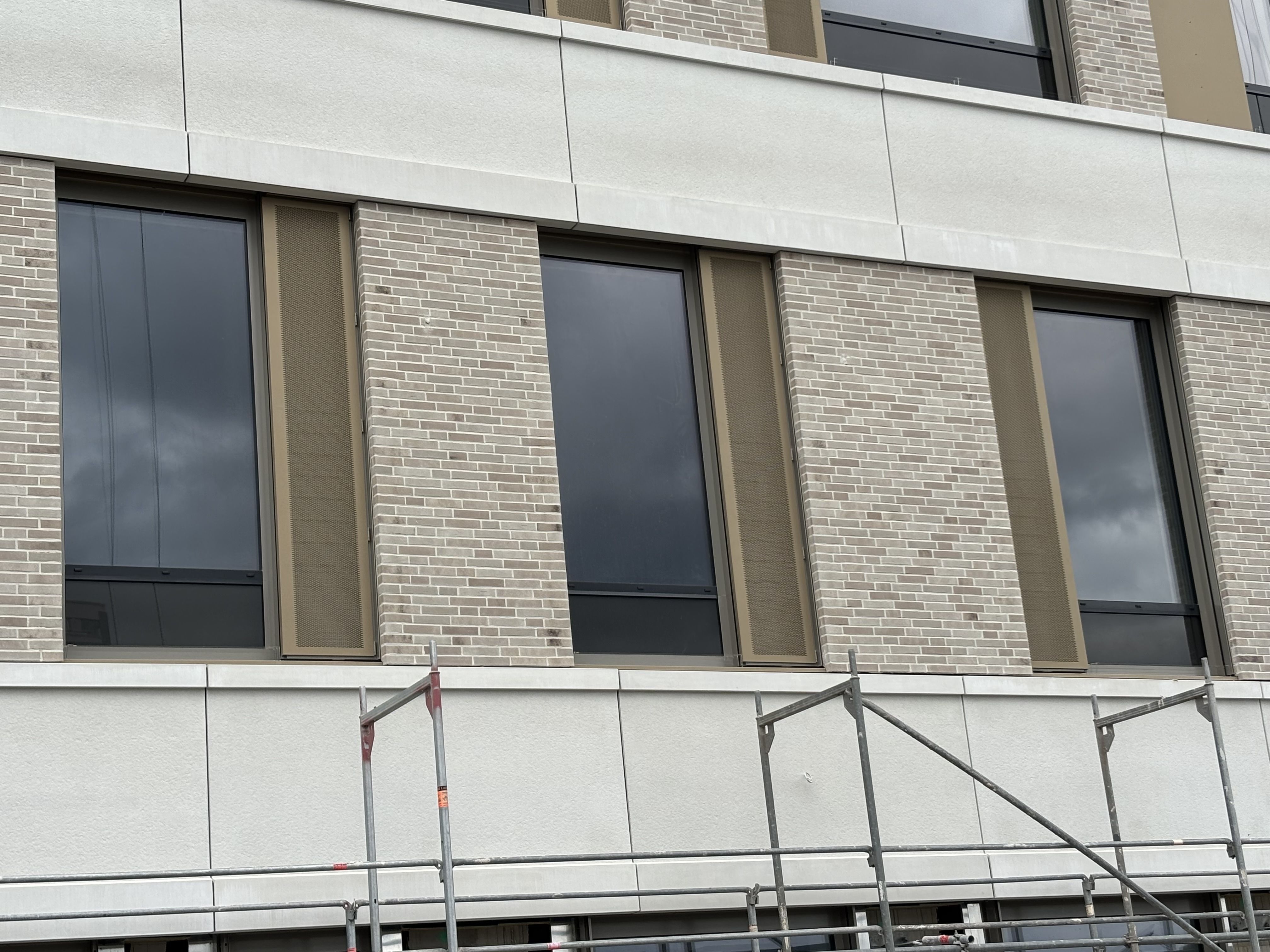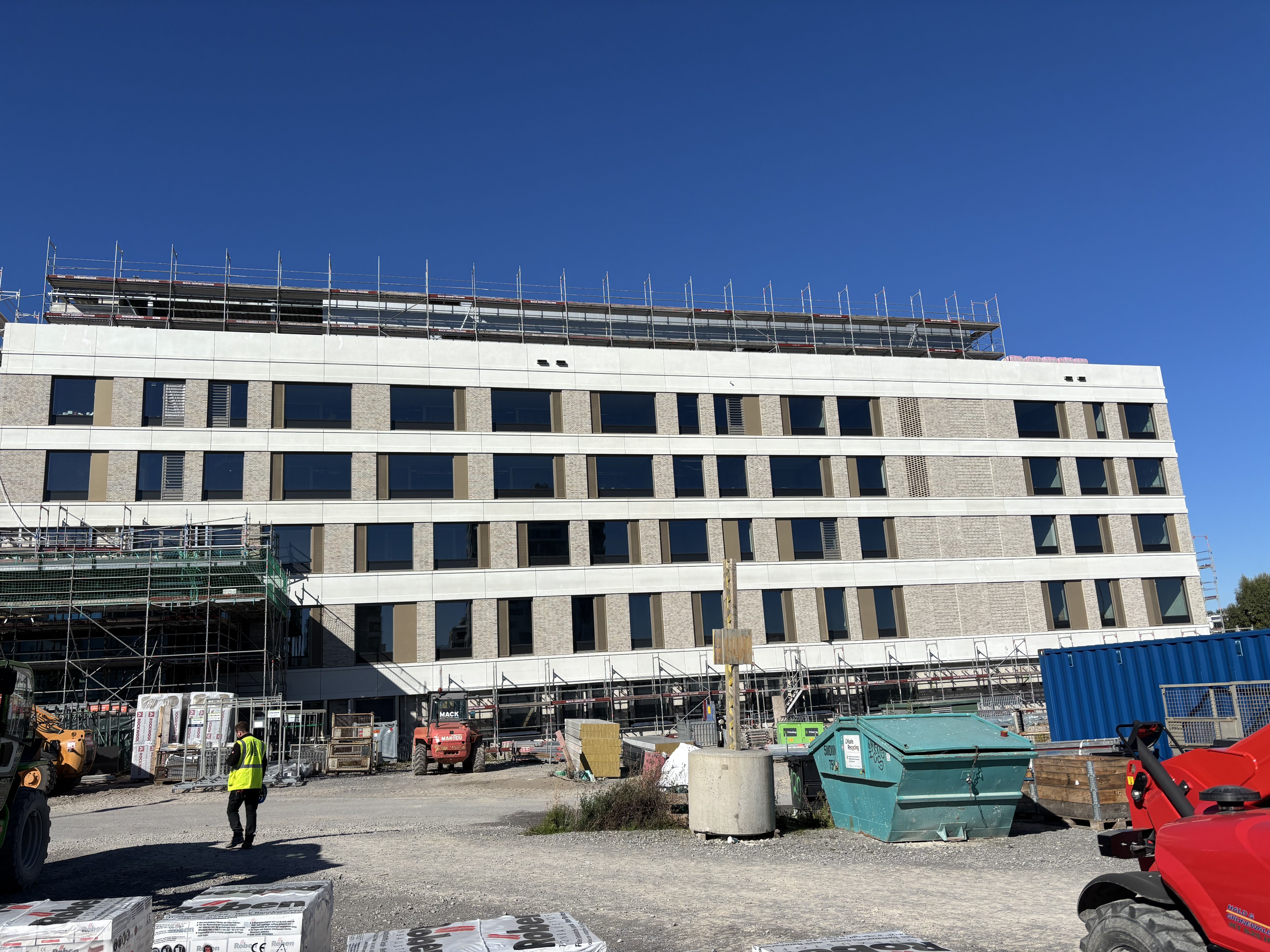 Wer in diesen Tagen am Langen See auf dem Flugfeld spazieren geht, hat freien Blick auf das Flugfeldklinikum. Denn das Gebäudeteil im Norden, die künftige Kinderklinik, ist schon gerüstfrei. Dahinter sichtbar wird die Fassade aus Klinikerriemchen und Glasfaserbeton. Die Klinikerriemchen in verschiedenen Sandfarben wurden einzeln gemauert und verspachtelt. Dafür hat man das gute Wetter im Frühjahr und Sommer genutzt, denn der verwendete Spezialkleber benötigt zum Trocknen mehrere Tage lang eine Temperatur über fünf Grad Celsius. In den nächsten Wochen montieren die Arbeiter weiter die bis zu 14 Millimeter starken Klinikerriemchen am Gebäude – solange es die Temperaturen zu lassen.